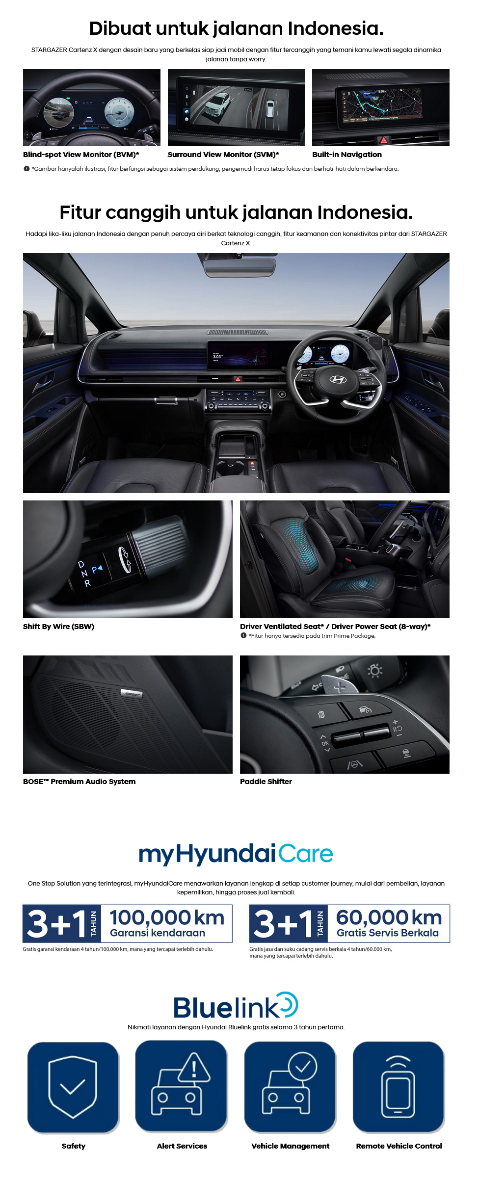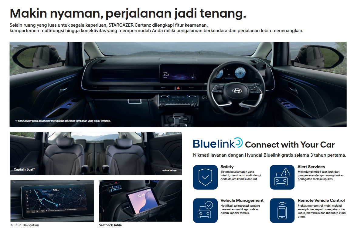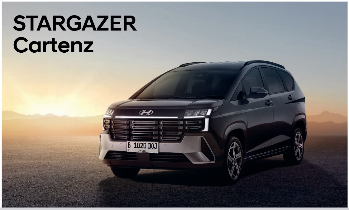 Hyundai STARGAZER Cartenz hadir sebagai MPV keluarga yang mengutamakan kenyamanan dan kecerdasan fitur. Penyegaran desain depan-belakang berpadu dengan fitur canggih seperti Smart Cruise Control dan built-in navigation yang tetap aktif meski sinyal hilang. Sistem keamanan Hyundai SmartSense meliputi BCA, LKA, FCA, dan lainnya—menjadikannya pilihan aman untuk perjalanan harian maupun liburan keluarga. Interiornya lapang dengan captain seat, seatback table, dan kapasitas bagasi mencapai 585 liter, cukup untuk stroller hingga koper besar. Dirakit secara lokal dengan TKDN >40%, Cartenz menjadi simbol kemajuan industri otomotif Indonesia.